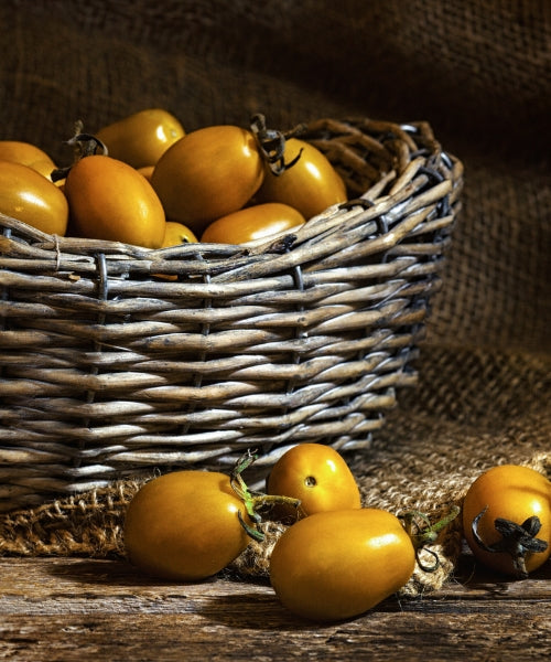 Antica varietà di pomodorini gialli raccolti a piena maturazione e tagliati in due parti (pacchetelle), messi in conserva manualmente e con grande cura in vasetti di vetro per preservarne la consistenza e la fragranza.